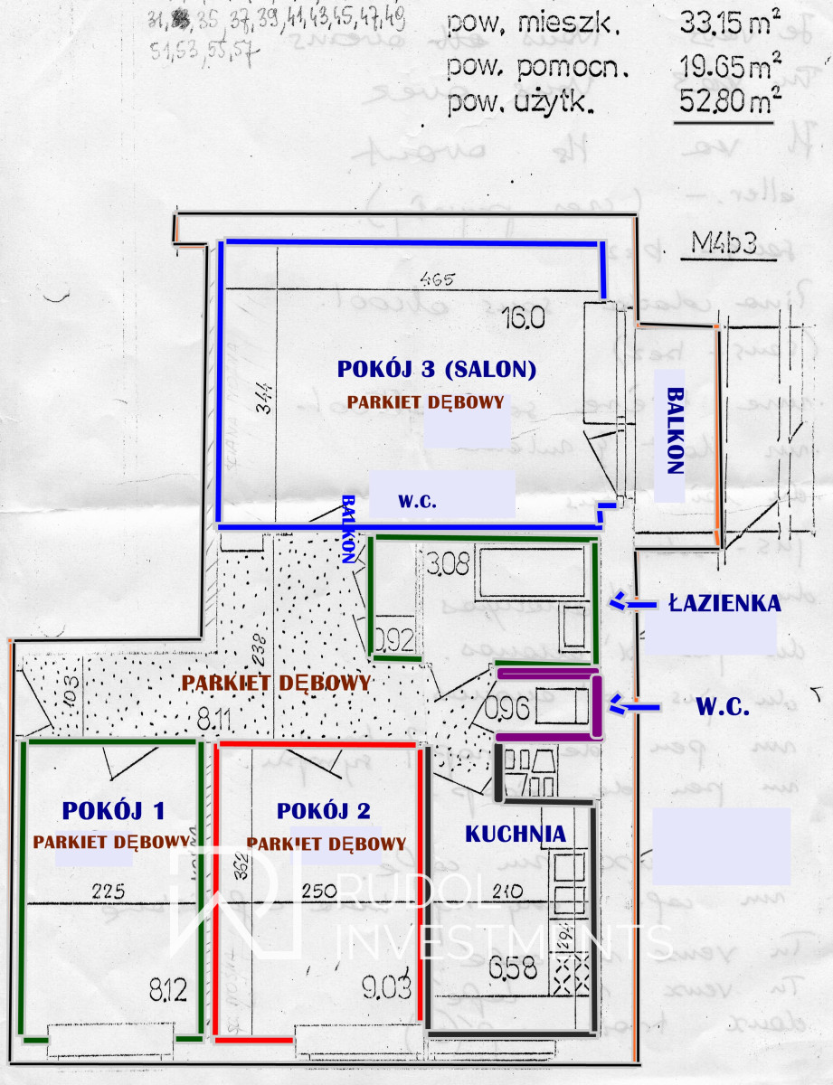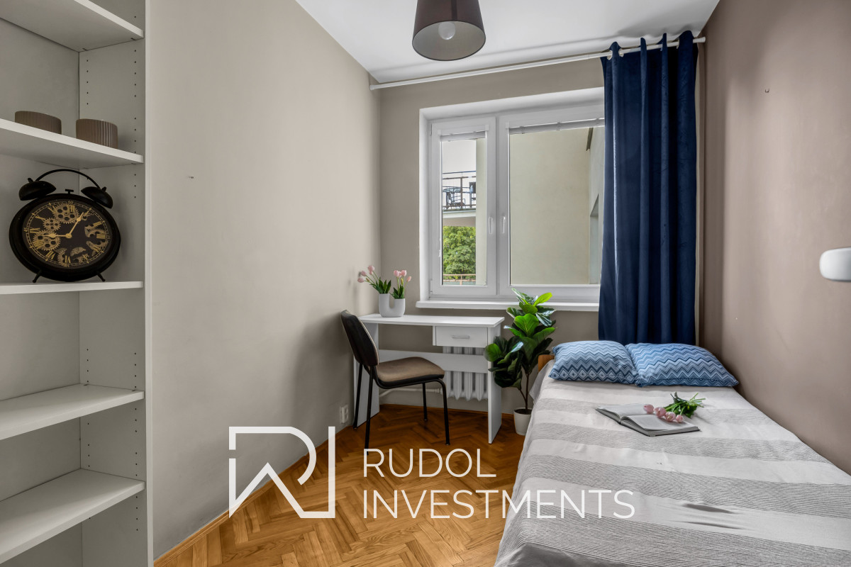 Mieszkanie ma bardzo wygodny układ - do każdego pomieszczenia wchodzi się bezpośrednio z przedpokoju, więc żadnych „przejściowych” pokoi, od razu widać, że każdy metr jest dobrze wykorzystany. W całym mieszkaniu leży drewniany parkiet - zadbany, w bardzo dobrym stanie, choć miejscami widać ślady użytkowania. Wystarczy małe cyklinowanie, żeby odzyskał pełny blask. W mieszkaniu pozostawiono też żeliwne kaloryfery, które dziś są prawdziwym hitem - zarówno estetyczne, jak i praktycznie. Największy pokój to salon z wyjściem na naprawdę duży balkon, ciągnący się przez całą szerokość pomieszczenia. To miejsce, które aż się prosi o poranną kawę, doniczkowe pomidory albo leniuchowanie w leżaku. W środku salonu stoją meble, które mogą zostać - jeśli ktoś lubi gotowe rozwiązania - albo spokojnie zniknąć, żeby zrobić miejsce na własne pomysły.