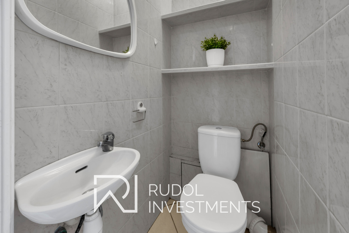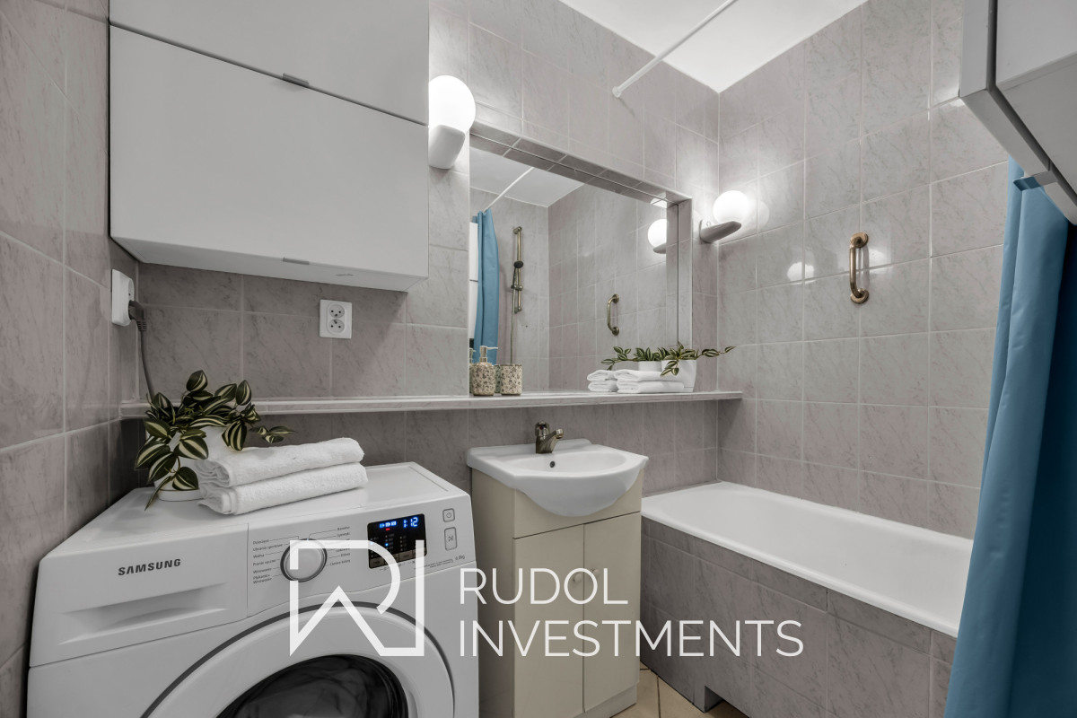 Kuchnia wychodzi na południe, więc słońce wpada tu przez większą część dnia. Wyposażona jest w białe, drewniane meble, a nowy grafitowy blat, zlewozmywak i bateria sprawiają, że przestrzeń jest świeża i przyjemna w codziennym użytkowaniu. Mieści się tu także mały stół z 2-3 krzesłami - idealny na „imprezy z lat 90.”, kiedy wszyscy i tak spędzają czas w kuchni, gadając, śmiejąc się i delektując jedzeniem. Łazienka z wanną, pralką, a osobne WC ułatwia życie codzienne.