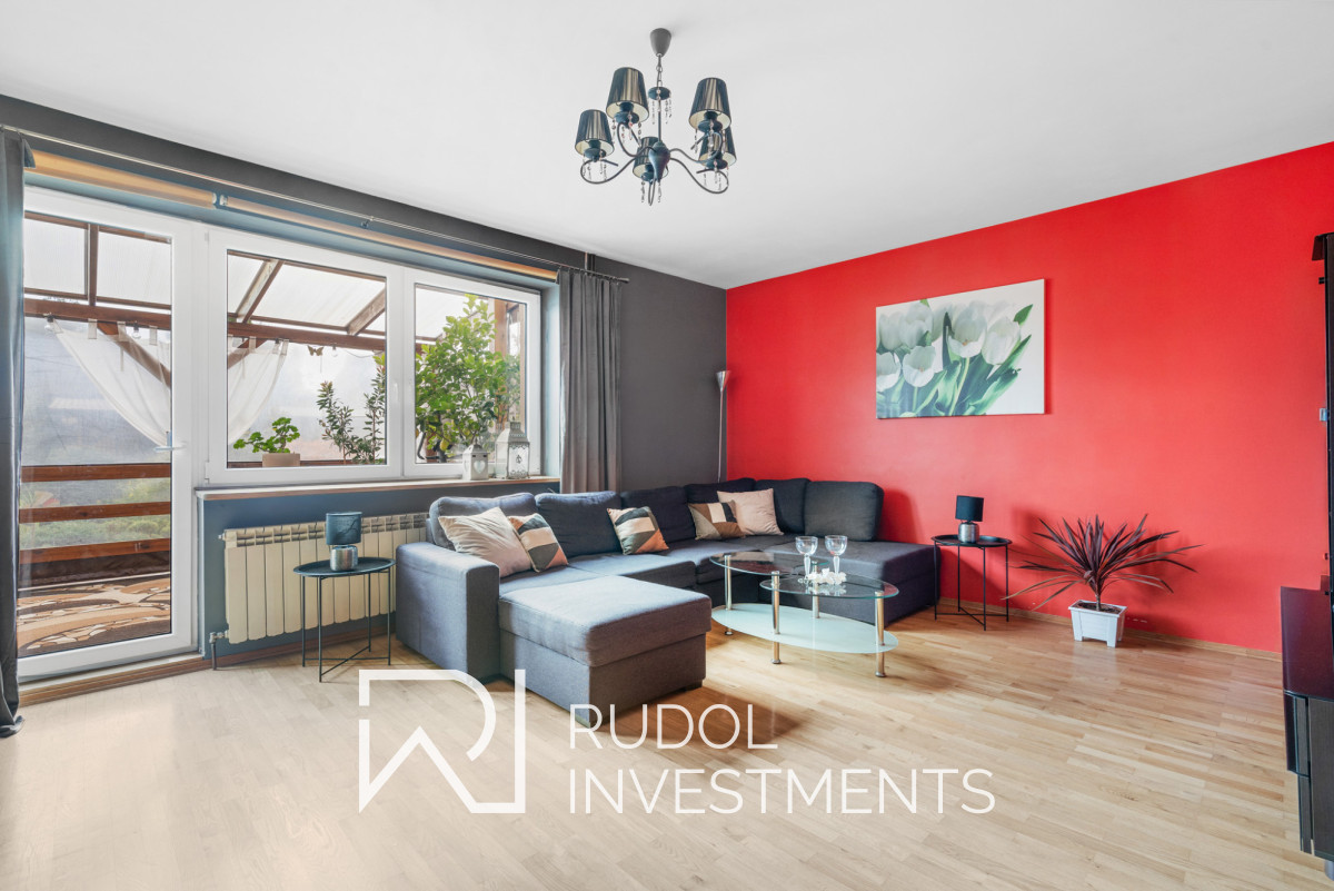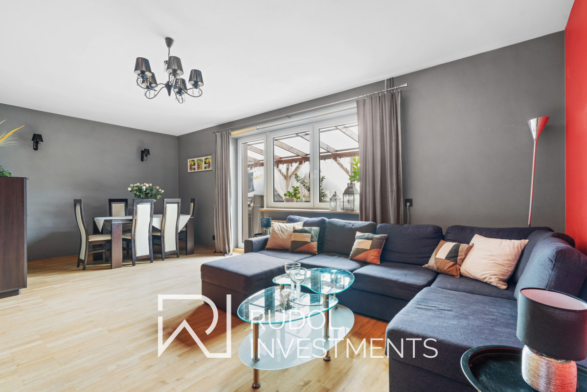 Przedłużeniem salonu jest przestronny, zadaszony taras, który idealnie sprawdzi się zarówno latem, jak i zimą. Dzięki zadaszeniu można korzystać z niego przez cały rok - jako miejsce na relaks, spotkania rodzinne czy dodatkową przestrzeń rekreacyjną, niezależnie od pogody.