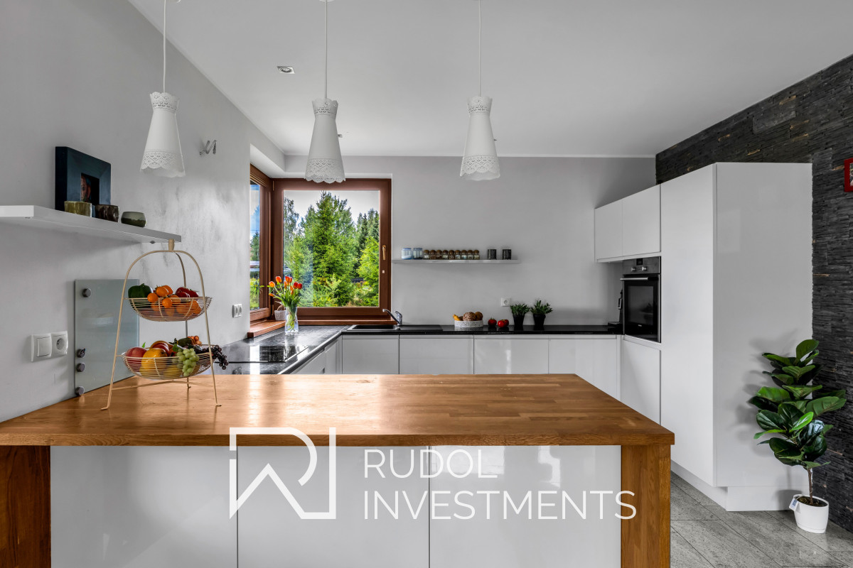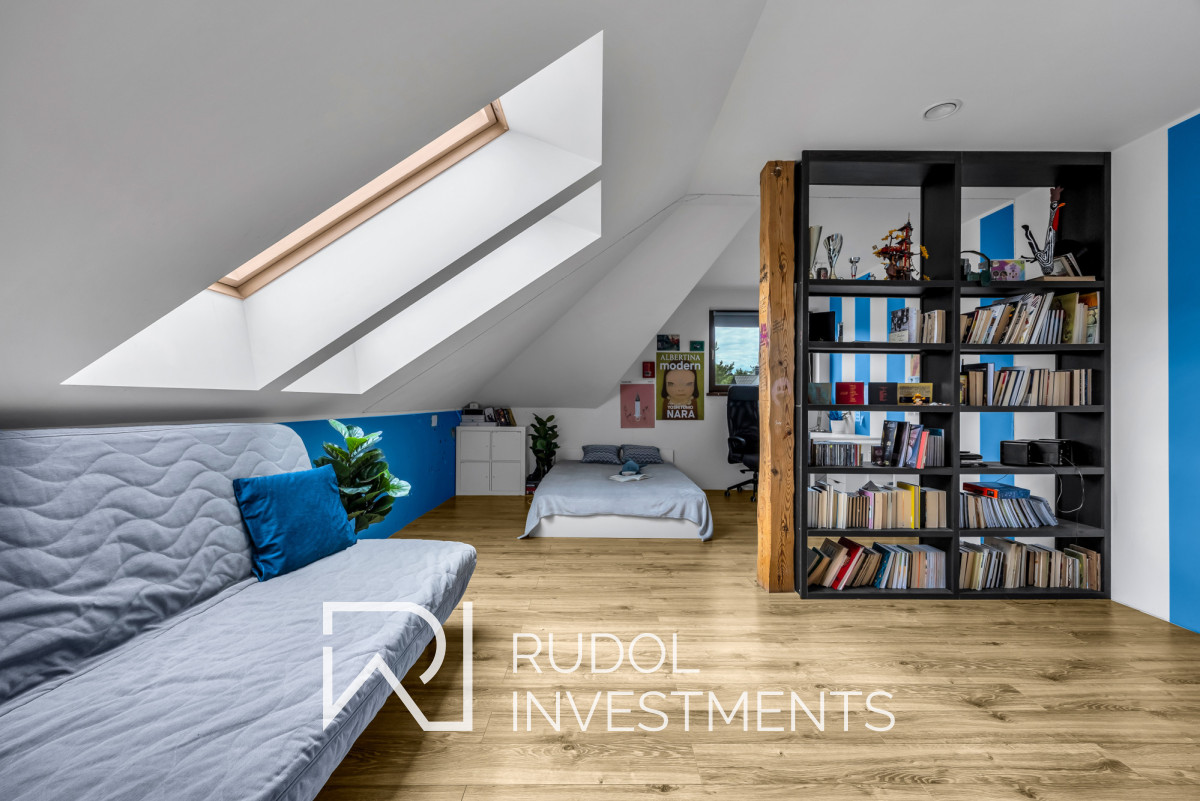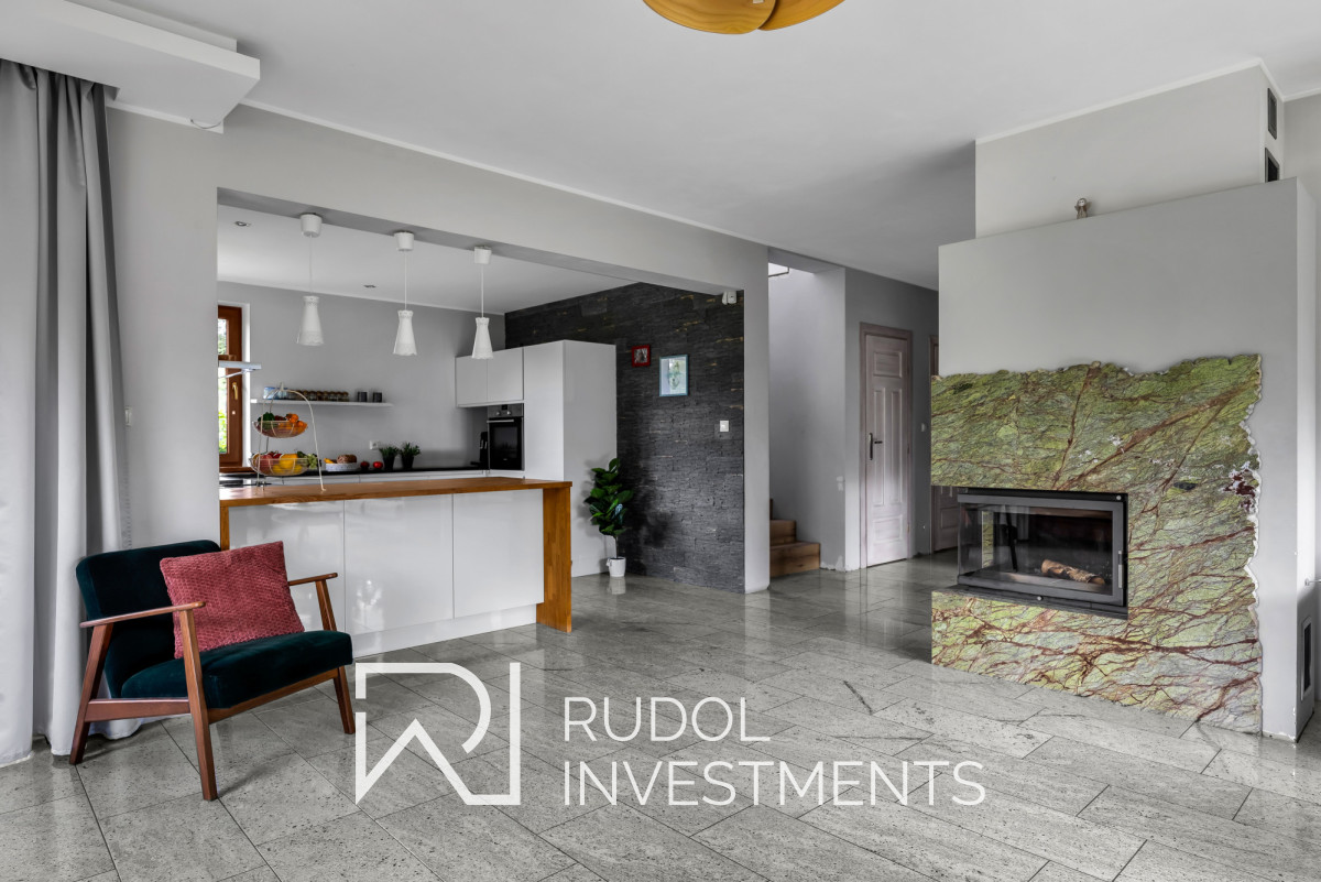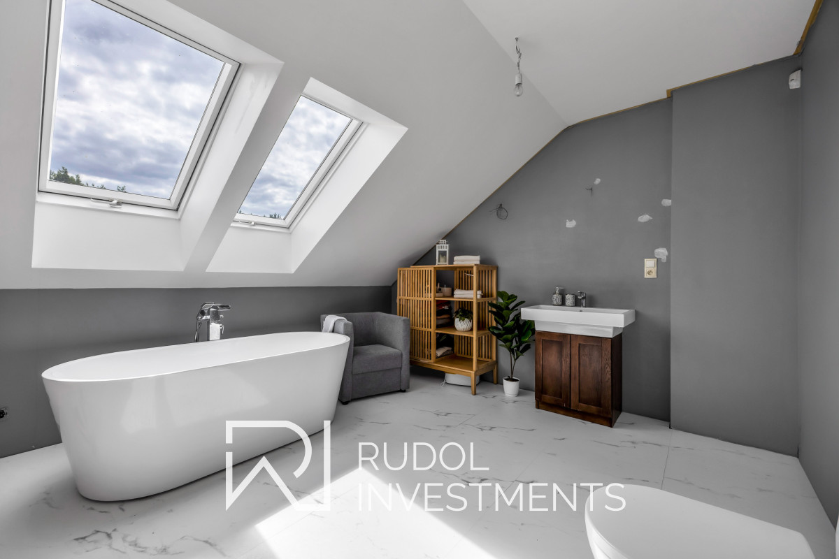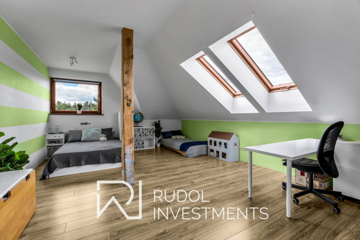 Dom charakteryzuje duża i jasna przestrzeń parterowa z wyjściem na taras i ogród oraz przestronne poddasze użytkowe gdzie usytuowane są 3 sypialnie, garderoba i łazienka. Dodatkowo mamy garaż jednostanowiskowy w bryle budynku.
