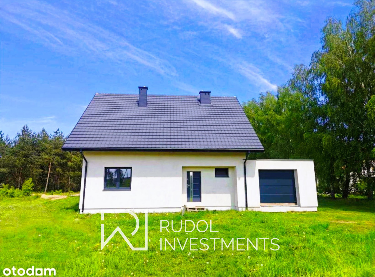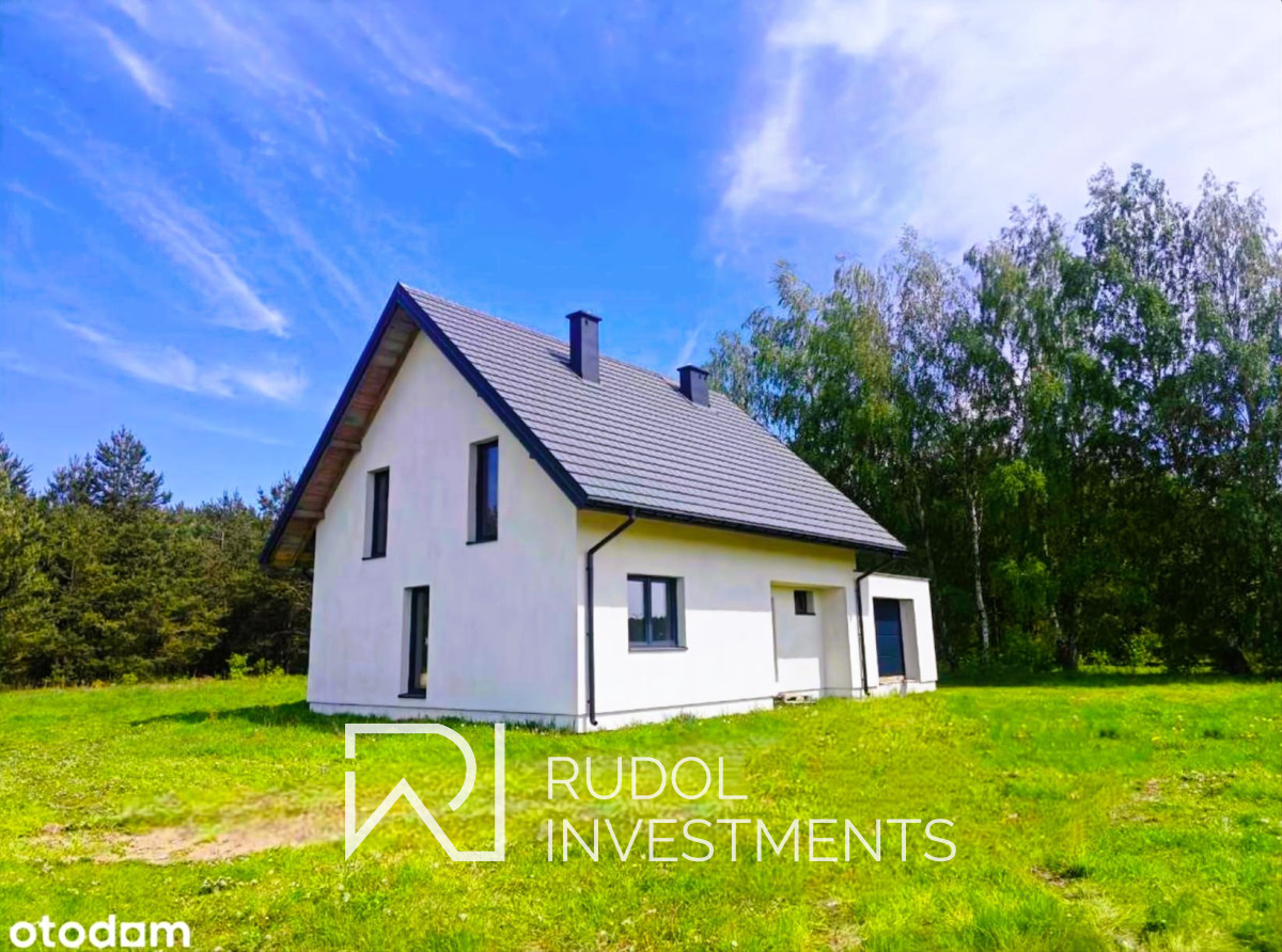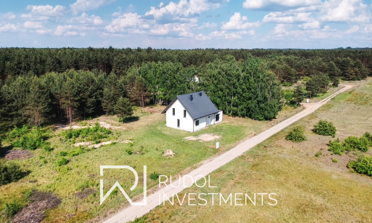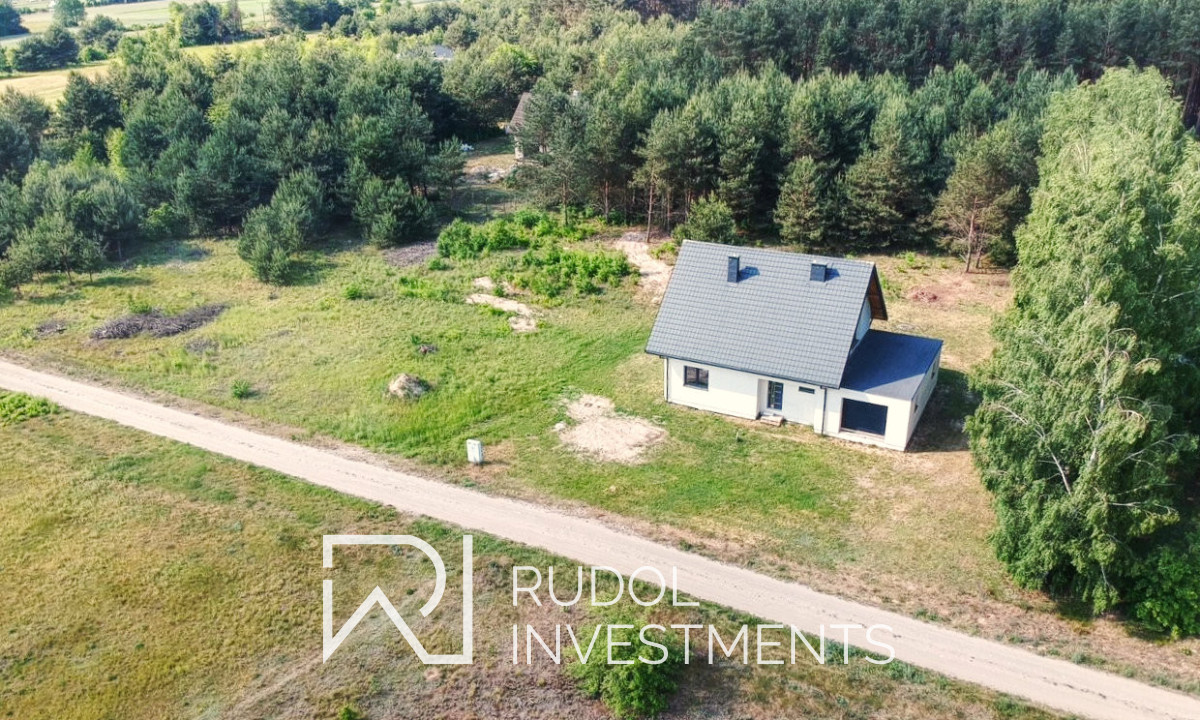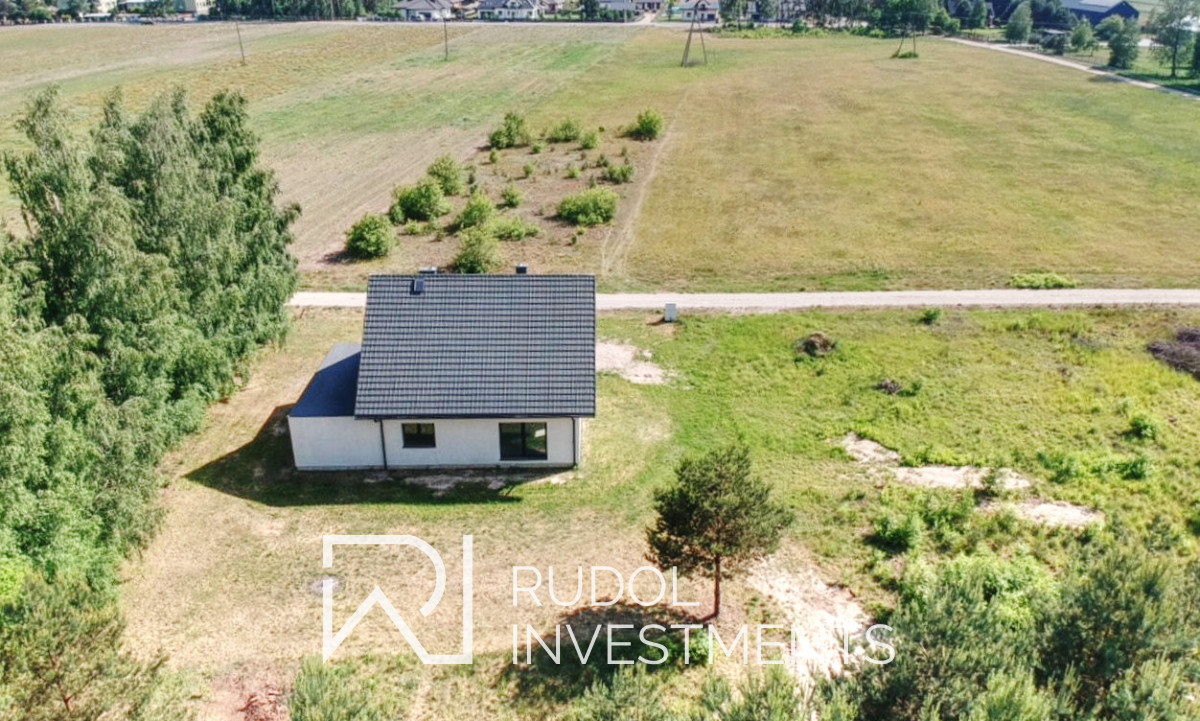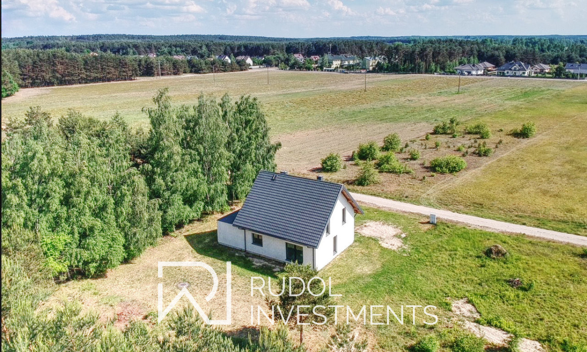 Prezentowana nieruchomość to dom wolnostojący usytuowany na działce o powierzchni 1259 m² przy utwardzonej drodze gminnej. Teren jest płaski, niezagospodarowany i nieogrodzony. W najbliższym otoczeniu nie ma obecnie zabudowań mieszkalnych, co oznacza, że nieruchomość sąsiaduje z otwartą przestrzenią. Budynek został zrealizowany na wzór projektu „W Malinówkach 11” i znajduje się w stanie surowym zamkniętym. Elewacja zewnętrzna jest ukończona, a garaż wyposażono w bramę Hörmann z napędem elektrycznym.