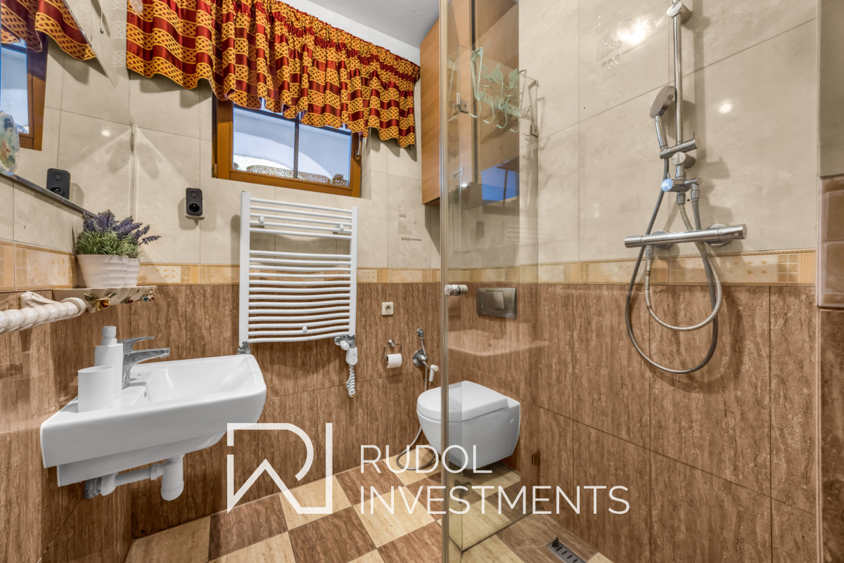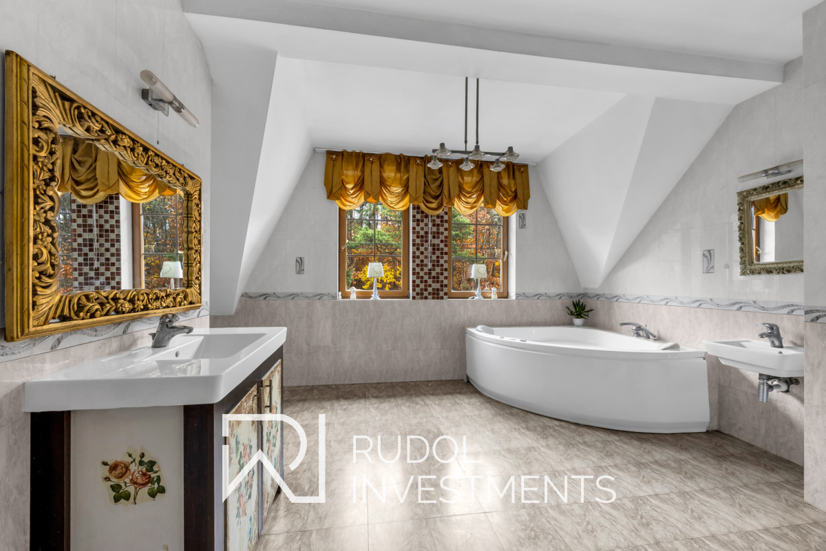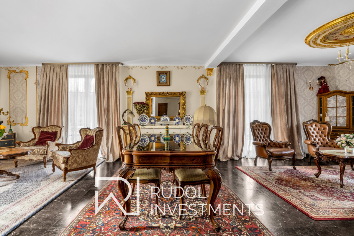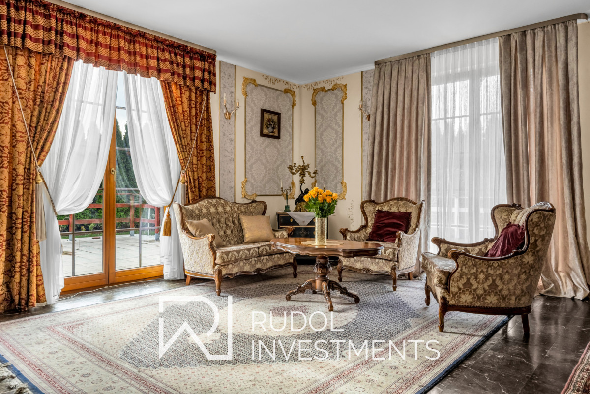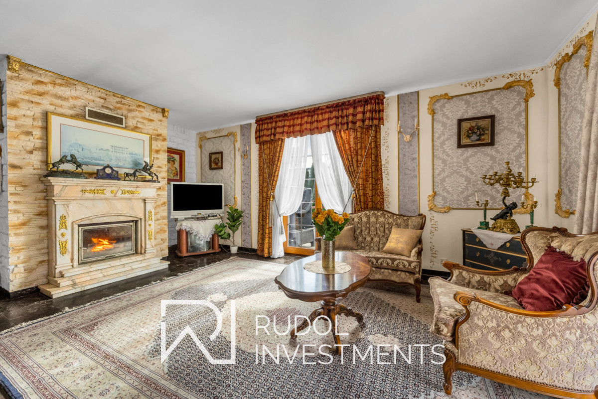Parter domu to reprezentacyjna, bogato wykończona przestrzeń. Styl wnętrza łączy ozdobność Wschodu z europejską klasyką. Centralnym punktem jest rozległy salon, przypominający trzy połączone pokoje. W części wypoczynkowej mamy kominek, który rozprowadza ciepło po całym domu jako dodatkowe źródło ogrzewania. Druga część pełni rolę jadalni z dużym stołem, a trzecia - kącika kawowego - zaprasza do rozmów przy aromacie mocnej kawy.