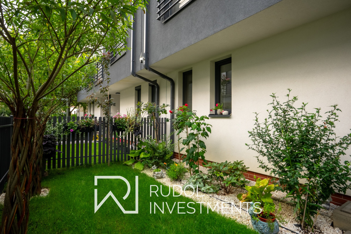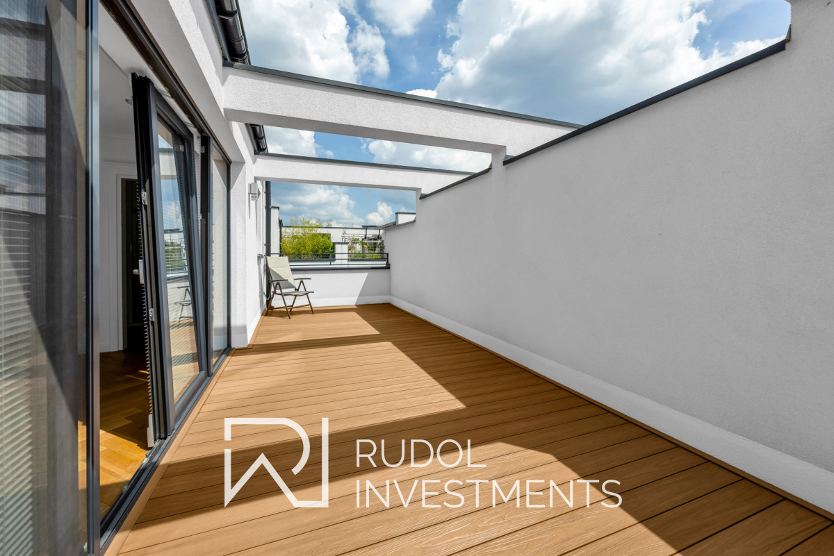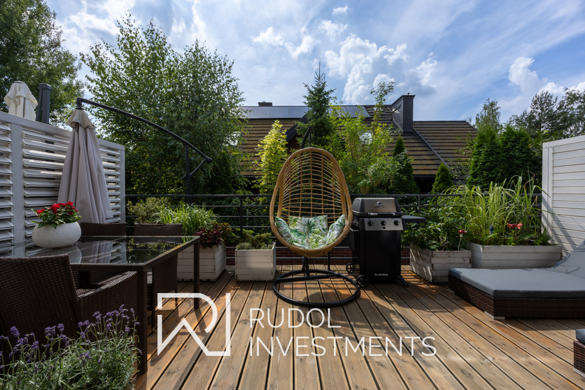 Całość doświetlają szerokie, przesuwne drzwi tarasowe - wystarczy jeden ruch, by wnętrze połączyło się z ogrodem. Taras wykończony jest naturalnym drewnem i gotowy do życia: komplet mebli ogrodowych, grill, przestrzeń do odpoczynku i spotkań. Drewniane żaluzje oraz moskitiery w oknach pozwalają cieszyć się świeżym powietrzem i światłem bez nieproszonych gości :)