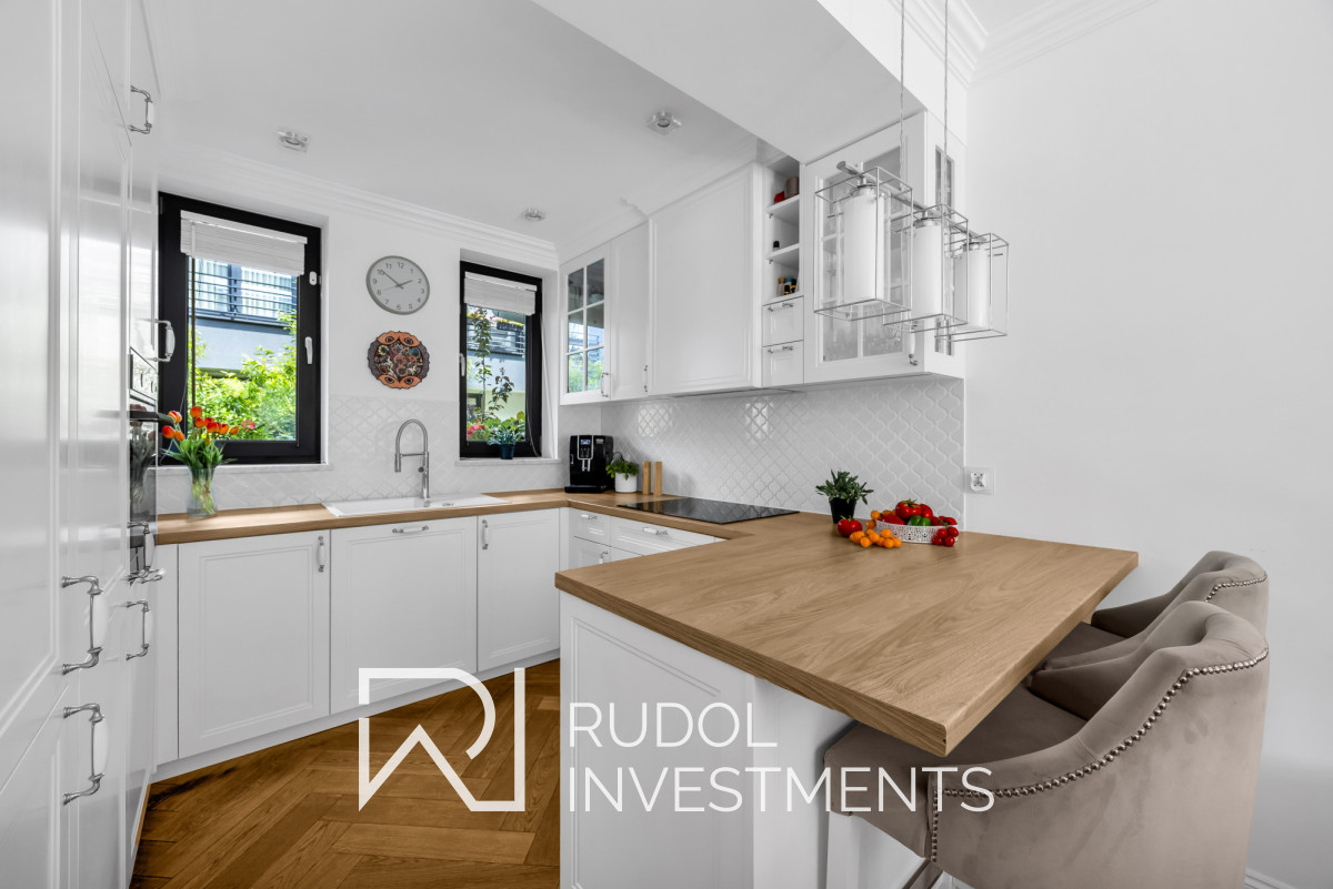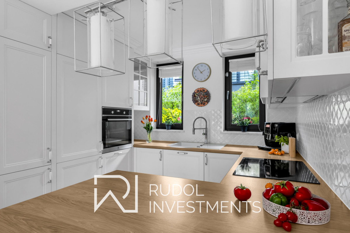 Kuchnia została wykonana na zamówienie - białe, drewniane fronty nadają jej ciepły, domowy charakter, a jednocześnie są solidne i ponadczasowe. Wszystko tu jest dobrze przemyślane: dużo blatu roboczego, sporo miejsca do przechowywania i pełne wyposażenie w sprzęt AGD - zmywarka, piekarnik, płyta, lodówka w zabudowie. Nic nie trzeba dokładać ani wymieniać - kuchnia jest gotowa do codziennego gotowania i wspólnych posiłków.