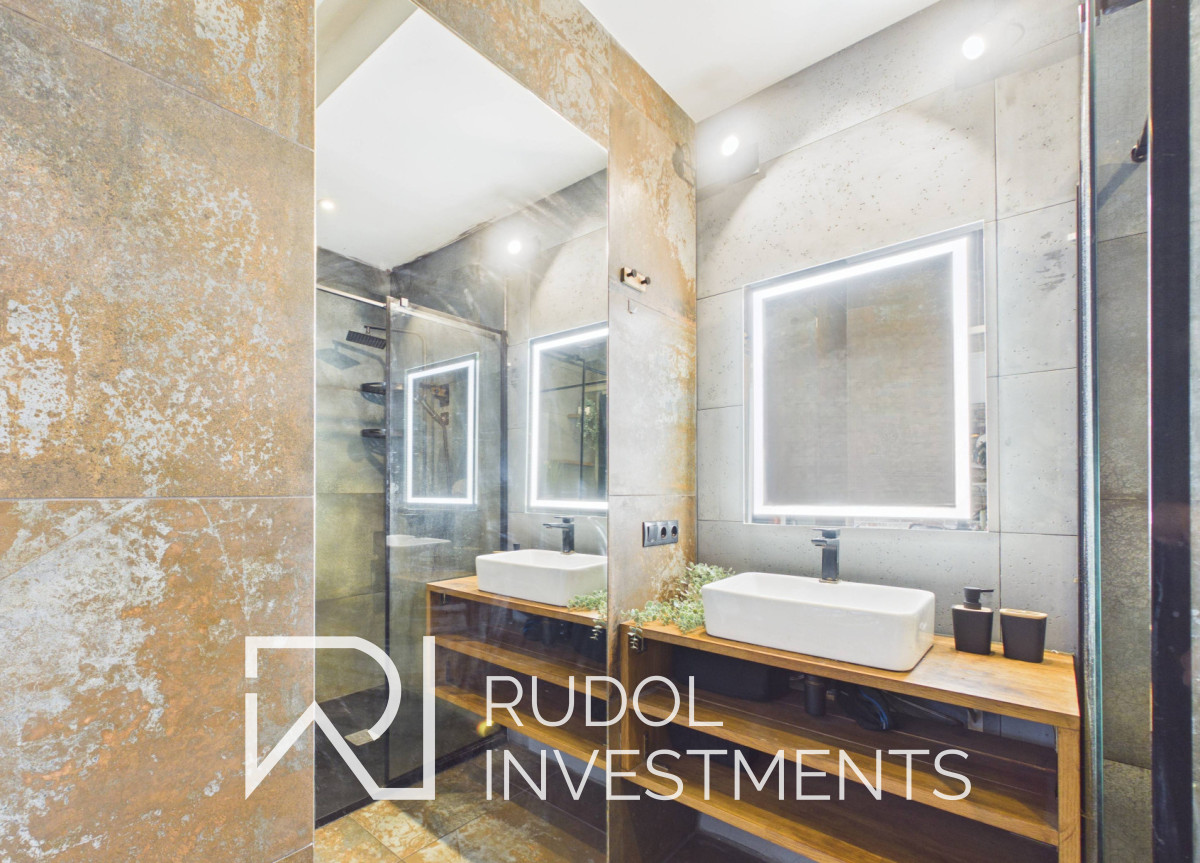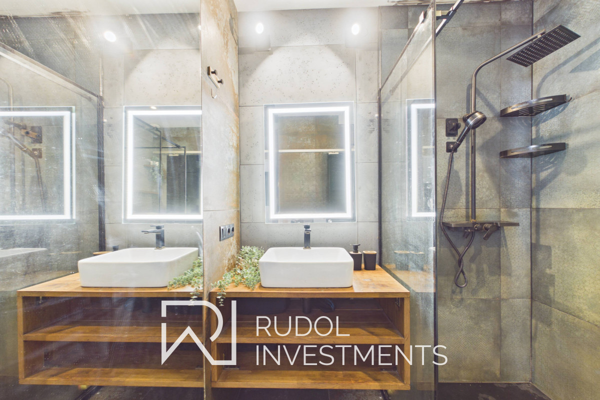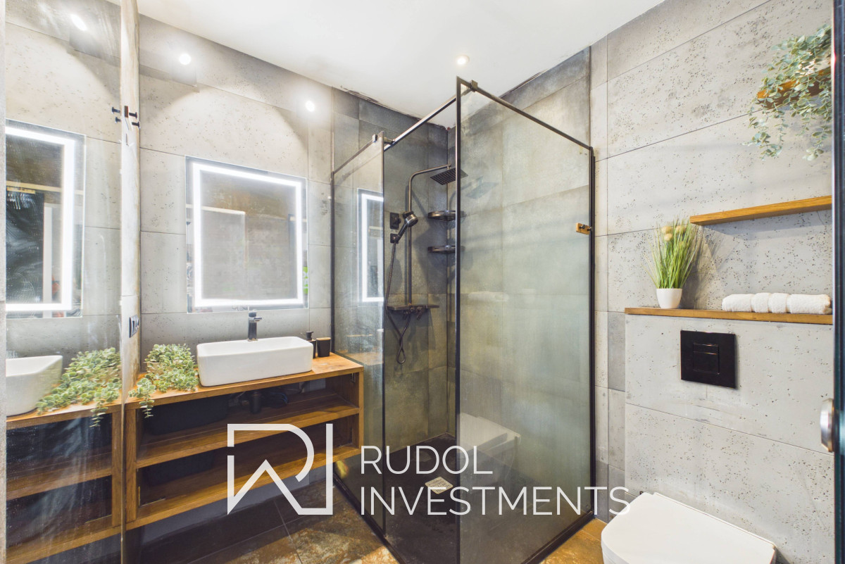 Łazienka z prysznicem, z wejściem przez przesuwne drzwi - od strony salonu wykończone lustrem, co dobrze wpisuje się w całą aranżację i optycznie powiększa przestrzeń.