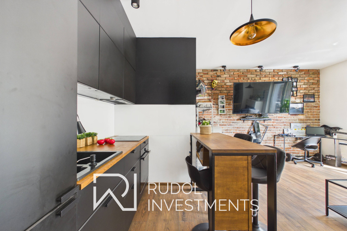 Salon to nie jest „typowy pokój z aneksem”. Wnętrze ma wyraźny pomysł: ściana z prawdziwej, starej cegły robi robotę od progu, a czarna kuchnia nadaje całości zdecydowanego, trochę loftowego charakteru. Wszystko jest spójne, bez przypadkowych rozwiązań.